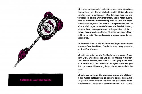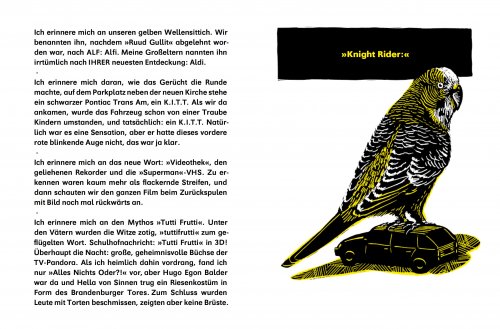 Ich erinnere mich an unseren Wellensittich Alfi und wie meine Großeltern ihn nannten: Aldi. Ich erinnere mich an Hakenkreuze und SS-Runen bei der Musterung. Ich erinnere mich daran, wie der Westen roch. Er kam mit dem Westbesuch und versprach gute Dinge. Geschenke, Essen in Restaurants, Fahrten in Westautos, freundliche ältere Menschen, Joghurt. Später kam ich drauf: Es war der Weichspüler.