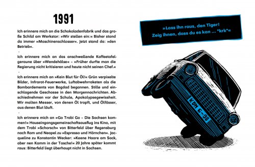 Ich erinnere mich an »Wiener Würstchen voran, lasst den Senf nicht stehn« statt »Pioniere voran, lasst die Fahnen wehn«. Ich erinnere mich an »Völlegefühl«, »unkaputtbar« und »Zahnarztfrau«. Den blauen Doppelstockbus mit der Werbung für Wodka Gorbatschow und die Spielzeugsoldaten: »Alle rüsten ab, und du rüstest auf«.