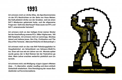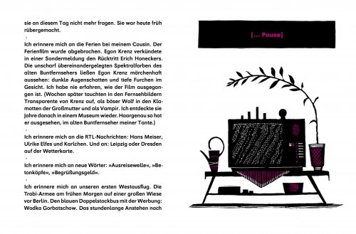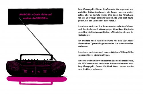 Ich erinnere mich an »Wiener Würstchen voran, lasst den Senf nicht stehn« statt »Pioniere voran, lasst die Fahnen wehn«. Ich erinnere mich an »Völlegefühl«, »unkaputtbar« und »Zahnarztfrau«. Den blauen Doppelstockbus mit der Werbung für Wodka Gorbatschow und die Spielzeugsoldaten: »Alle rüsten ab, und du rüstest auf«.