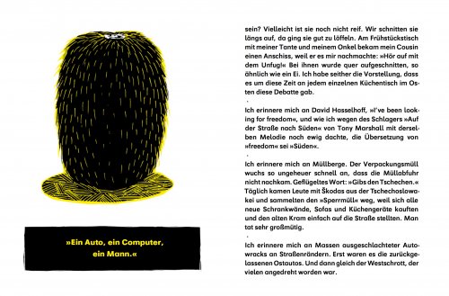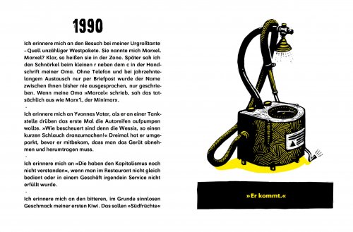 Ich erinnere mich an unseren Wellensittich Alfi und wie meine Großeltern ihn nannten: Aldi. Ich erinnere mich an Hakenkreuze und SS-Runen bei der Musterung. Ich erinnere mich daran, wie der Westen roch. Er kam mit dem Westbesuch und versprach gute Dinge. Geschenke, Essen in Restaurants, Fahrten in Westautos, freundliche ältere Menschen, Joghurt. Später kam ich drauf: Es war der Weichspüler.